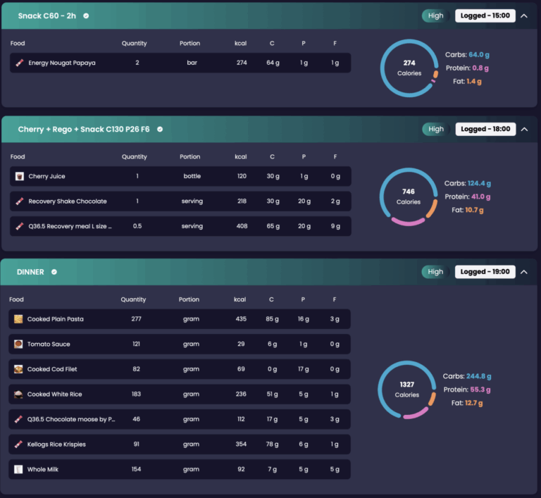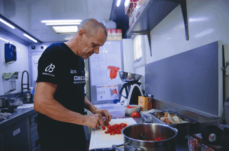 Breakfast was light but carb-rich: pancakes and low-fibre bread. Three and a half hours before the start came the all-important rice porridge — “super easy to digest, low in fat and protein.” Two hours out, a sugar snack; an hour before, bicarbonate and caffeine. Ice gels fought the Spanish heat. With little chance to drink during the effort, hydration had to be banked beforehand.